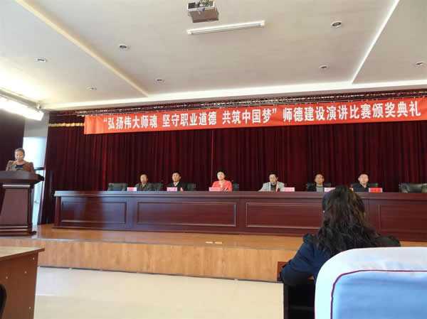 11月7日,北镇市总工会隆重举行“弘扬伟大师魂,坚守职业道德,共筑中国梦”师德建设演讲比赛颁奖典礼。北镇市委副书记、总工会主席赵春刚,总工会党组书记、常务副主席郝丽彬、北镇市教育局领导及广大教师共260余人出席此次颁奖典礼。