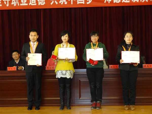 颁奖典礼上,授予韩伟男等4名同志 “北镇市五一劳动奖章、师德模范”荣誉称号,授予张连月等8名同志 “师德模范”荣誉称号,授予王桂兰等9名同志“师德标兵”荣誉称号,并颁发了奖牌和荣誉证书。颁奖表彰后,荣获北镇市“五一”劳动奖章荣誉称号的四位获奖教师为大家进行了精彩的演讲,再次展示了广大教师的风采。