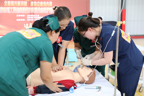 备受瞩目的“综合急救”环节,将团队协作的力量展现得淋漓尽致。参赛队伍需在短短5分钟内,完成对模拟心脏骤停患者的全面抢救。选手们迅速而准确地评估病情,紧接着实施心肺复苏,操作除颤仪,建立静脉通路,每一个动作都精准连贯,配合默契有序。在这个过程中,他们不仅注重技术规范,更将人文关怀融入其中,用温暖的话语和坚定的眼神给予“患者”最大的安慰和鼓励。