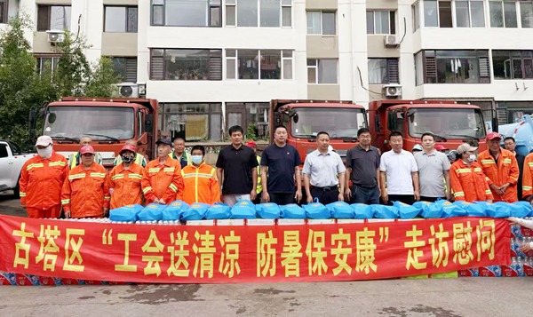 古塔区总工会为保障高温环境下作业劳动者的健康,防范风险,维护其劳动安全权益,组织开展了“送清凉”活动。区委书记焦健、区委副书记兼政法委书记朱洪、区政府副区长才华及相关单位负责人参与慰问。