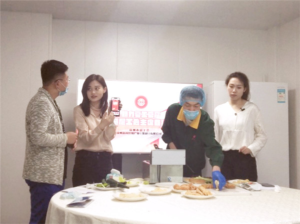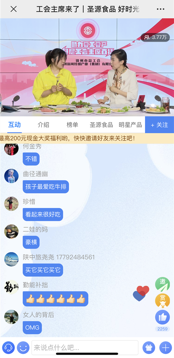 参加第一期直播的是辽宁圣源食品有限公司,这是锦州市黑山县一家集饲料加工、肉鸡养殖、屠宰加工、熟食产品加工销售于一体的现代食品加工企业,是国内外诸多大型炸鸡、汉堡连锁快餐店的供应商,产品质量有保证。为了让网友能够直观的了解这些优质产品,在直播现场,珊丹特意带来了企业十种热销的熟食制品进行展示,在介绍产品的同时,第二直播室的工作人员也在油锅前忙碌着,炸制着这些熟食制品,滋滋的炸东西声不绝于耳,很快一盘又一盘美味的食物被端上餐桌,供直播现场的主持人和工作人员品尝。大家纷纷称赞食品肉质鲜美、外酥里嫩,连连高呼好吃,直播间的活跃度不断提升,网友纷纷留言“好吃”、“买它买它买它”……全程2个小时的直播,共吸引粉丝11.63万人次观看。