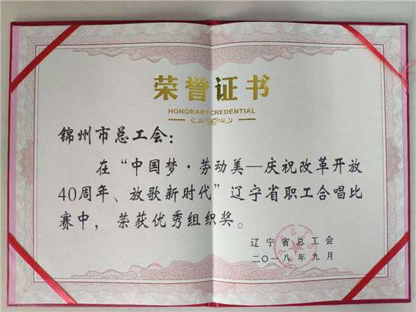 由锦州市总工会精心筛选,72人组成的“锦州市职工合唱团”代表我市职工参赛,参赛曲目为《我爱你中国》、《天路》。曲目优雅婉转、声部层级分明、合声自然和谐、堪称天籁之音,我市职工合唱团的演唱赢得专业评委的高分,博得现场观众的热烈掌声,最终获得大赛金奖的佳绩,锦州市总工会荣获优秀组织奖。
