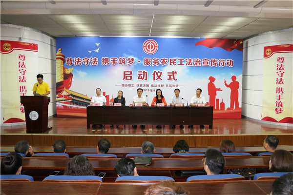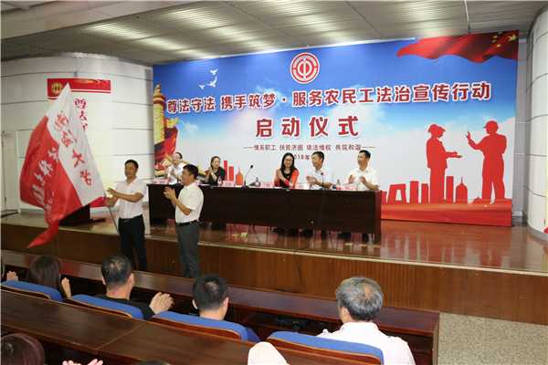 9月4日由锦州市总工会和渤海大学联合开展的“尊法守法•携手筑梦”服务农民工法治宣传行动启动仪式在渤海大学图书馆学术报告厅举行。市委常委、宣传部长王功生、省总工会权益保障部副部长张运秋、渤海大学副校长方鸿志及市总工会及各县(市)区总工会领导、老师、学生、律师志愿者代表150余人参加启动仪式。启动仪式由锦州市总工会党组书记、工会主席孙志海主持,要求服务农民工法治宣传行动要贯彻落实全总、省总要求,依托高校深入学习贯彻习近平新时代中国特色社会主义思想和党的十九大精神,扎实开展新形势下农民工法律服务工作,切实维护农民工合法权益。