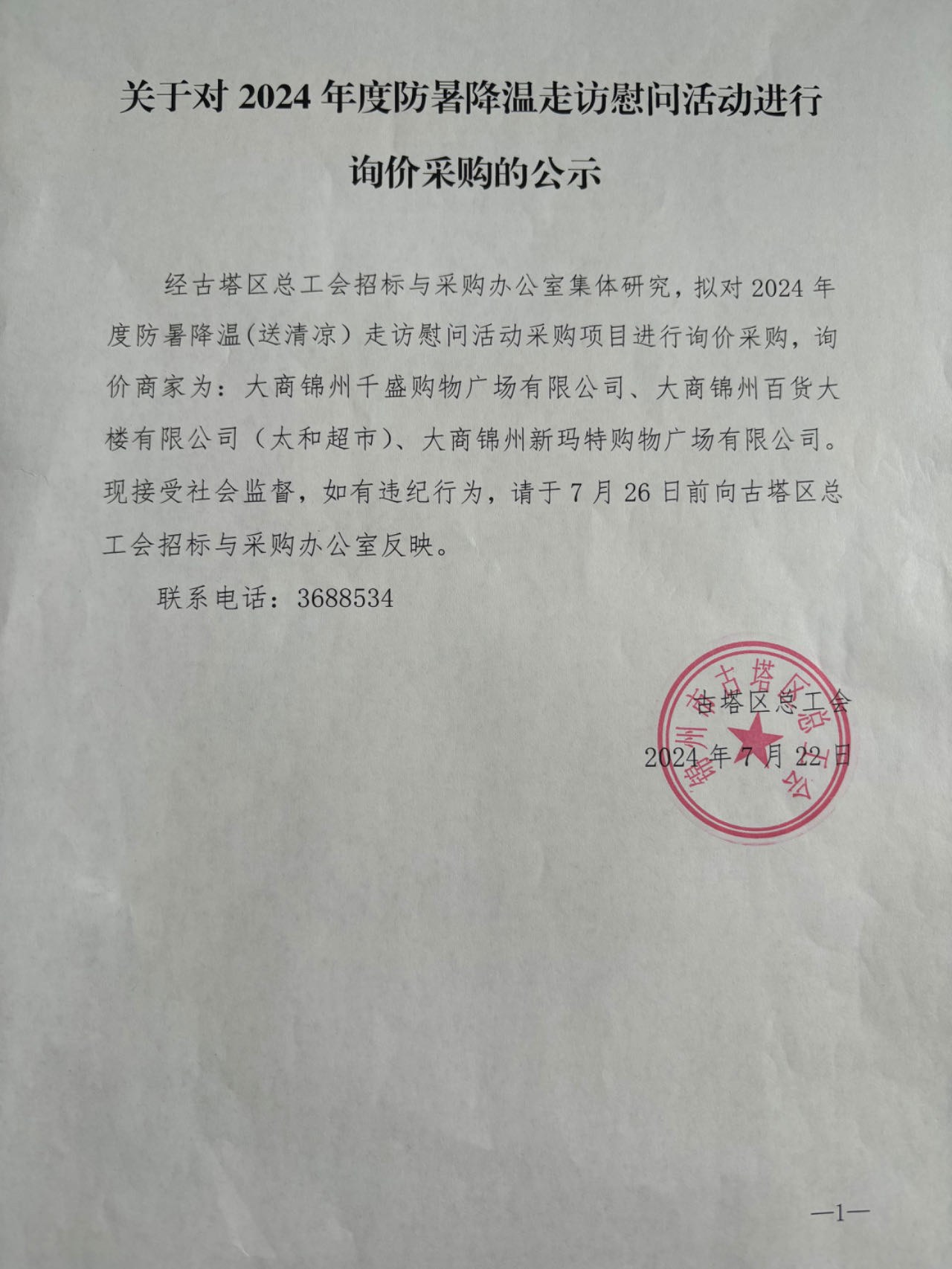 古塔区总工会关于对2024年度防暑降温走访慰问活动进行询价采购的公示