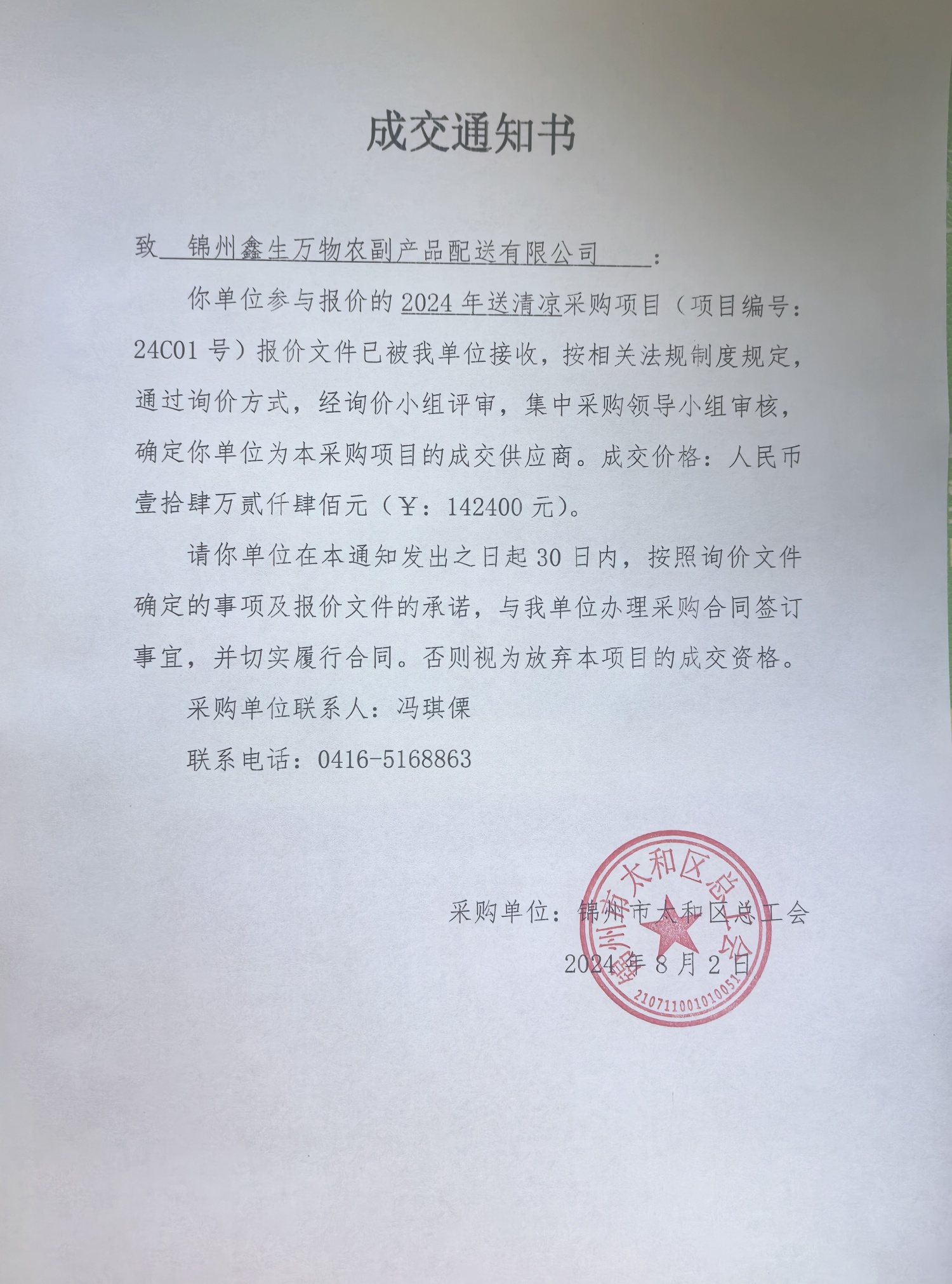 太和区总工会关于对2024年送清凉进行询价采购成交通知书