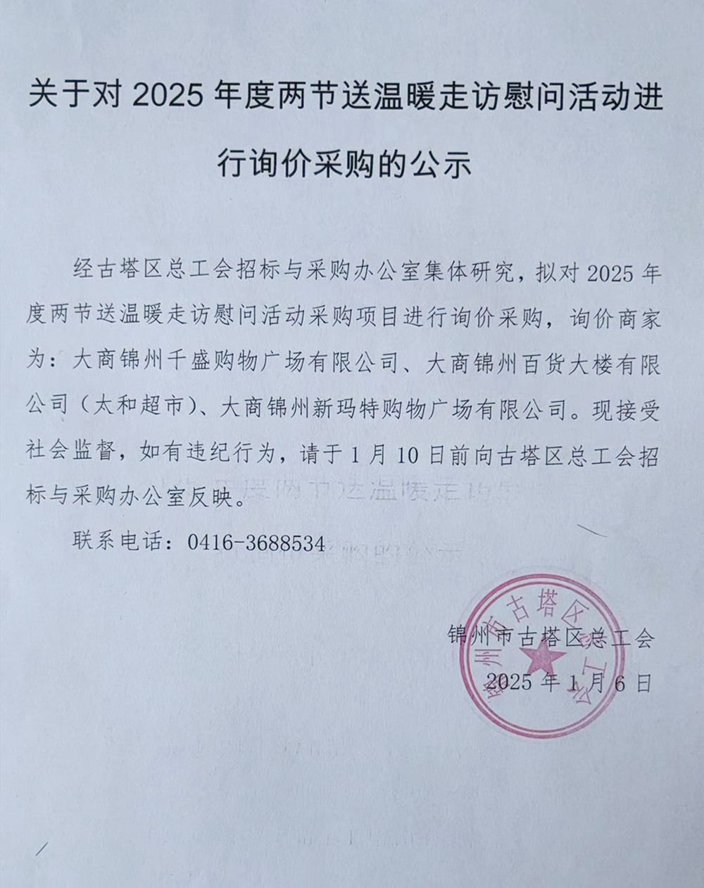 古塔区总工会对2025年度两节送温暖走访慰问活动进行询价采购的公示