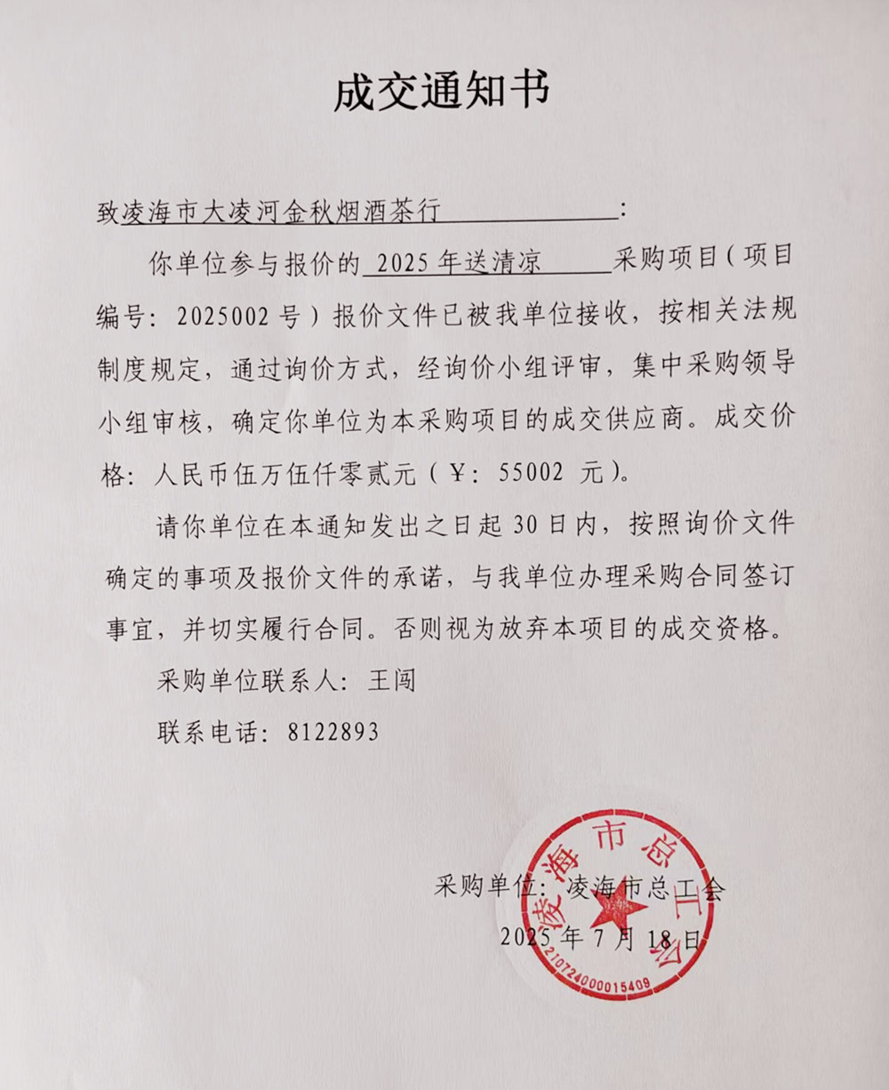 凌海市总工会关于2025年送清凉采购项目的成交通知书