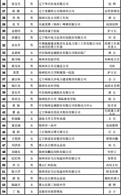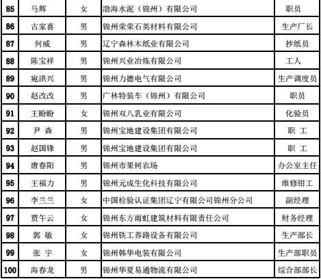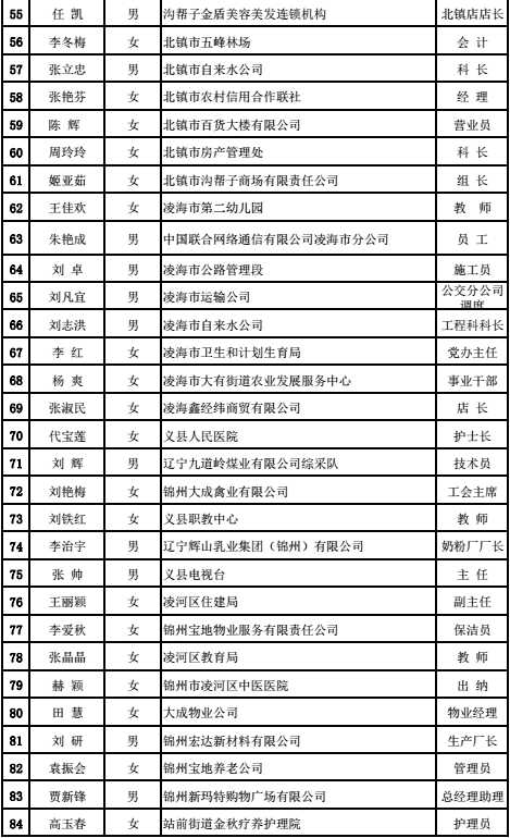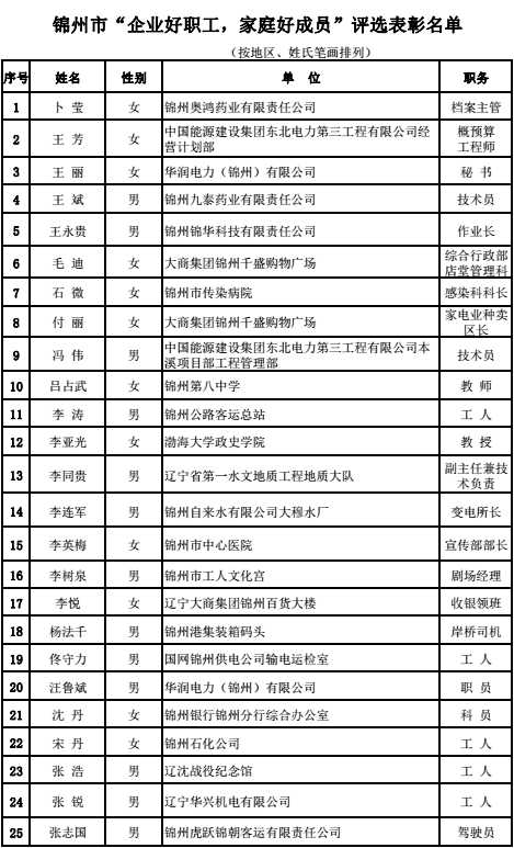 锦州市“企业好职工,家庭好成员”表彰名单