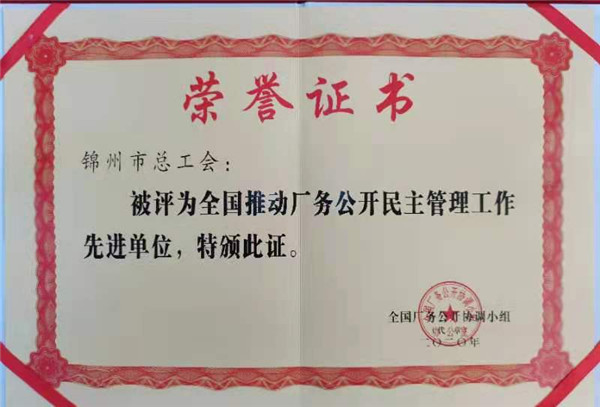 锦州市总工会荣获全国推动厂务公开民主管理工作先进单位