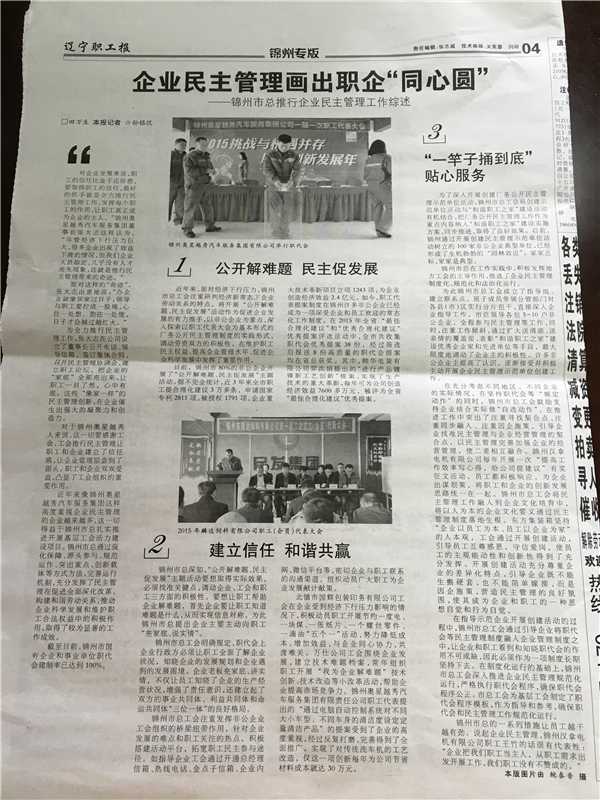 报道以锦州奥星越秀汽车服务集团公司推行民主管理给企业带来的“奇迹”为引导,分公开解难题、民主促发展——建立信任、和谐共赢——“一竿子捅到底”贴心服务三个部分进行了详细的报道。近年来,锦州市总注重研判经济新常态下企业劳动关系特点,以省总基层工会活力建设项目和市总“和谐职工之家”建设为主要载体,以开展“公开解难题、民主促发展”主题活动和创建厂务公开民主管理示范单位活动作为有力推手,把非公企业作为重点深入探索了以职工代表大会为基本形式和以集体协商为重要机制的厂务公开民主管理制度的实践形式,调动了劳资双方的积极性,在维护职工民主权益、提高企业管理水平、促进企业科学发展中发挥了重要作用。目前,全市100%的国有企业和事业单位以及80%的百人以上非公企业建立了职代会制度,开展了“公开解难题、民主促发展”主题活动。在2015年省总工会开展的全省“百佳合理化建议”评选活动中,锦州市总选送的8项职代会提案全部获奖;其中,1项提案获评全省“最佳合理化建议”优秀提案,7项提案获评全省“优秀合理化建议”优秀提案。100家开展创建厂务公开民主管理示范单位活动的非公企业典型单位,已经形成了生机勃勃的“园林效应”。在工作实践中,锦州市总和各县(市)区总一竿子插到底,积极发挥地方工会的主导和指导作用,推进了企业民主管理制度化、规范化和法治化运行。