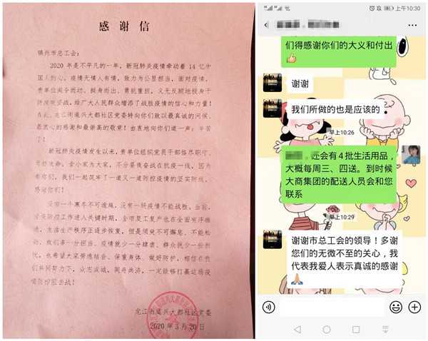 近日,市总工会机关到社区执勤的党员干部收到来自龙江街道兴大都社区党委的一封感谢信。像这样来自社区、基层工会、企业职工、驰援一线医务人员家属等各个群体的感谢声,市总党员干部听到了很多次,被感谢的同时,也收获了一次次的感动。