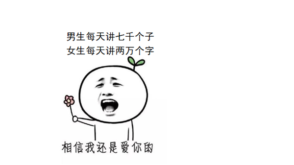 男人每天说7千个字,女人每天说2万个字。男人的话在工作的时候就说完了,女人在家哄孩子时候说的话都不叫说话,想想这2万个字都要等着老公回来才说。所以你一回到家就会听到老婆的喋喋不休,这就是男女的沟通。