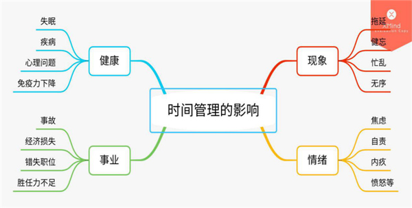 如果我们不能对自己的时间进行很好的管理,那么生活可能会杂乱无章,做事没有计划、没有规律、效率低、效果差;还会经常丢三落四忘记事情。仅仅如此还算好的,还有可能由于经常的拖延、遗忘而造成工作、生活上的损失或者事故,甚至胜任力不足错失加薪升职的机会。这些影响还不算,我们可能由于长时间的忙乱、健忘、拖延而引发自己的焦虑、自责、内疚、愤怒、无力、无助甚至绝望等情绪,甚至有的人因此而产生失眠、腹泻等躯体症状,长期下去会对我们的身心健康造成极大的伤害!