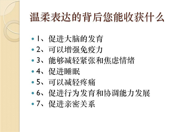 因为在为新生儿持续做抚触后,婴儿的性格比较独立,勇敢,充满自信,对人的身心健康发展有非常好的助力,这些现象引起了科学界关注,目前抚触已经进入脑科学和心理学的新领域,抚触的应用已经帮助了更多的群体,抚触是健康花园中的一朵奇葩,美丽芬芳,这是一朵,我们自己就可以栽培的爱的花朵,真心祝愿您能够借助抚触,帮助爱人和自己缓解焦虑情绪,从而使您的婚姻充满活力,幸福美满!