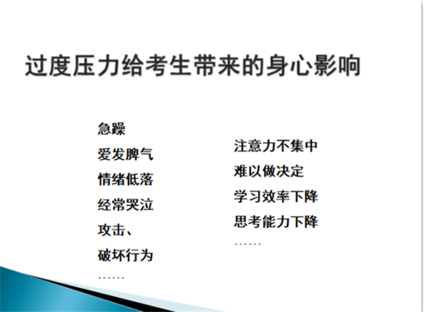 心理压力来源于三个方面,分别是:学校、家长和自己。如果适当的压力会让孩子在备考阶段产生动力,过大的压力就会是“最后一根稻草”,让孩子无力考试,导致身心崩溃。